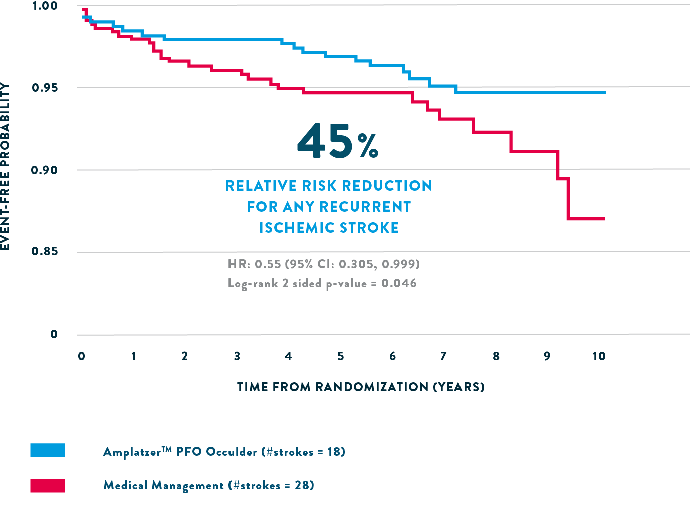 The RESPECT trial revealed a 62% relative risk reduction for recurrent cryptogenic ischemic stroke with the Amplatzer PFO Occluder vs medical therapy.1