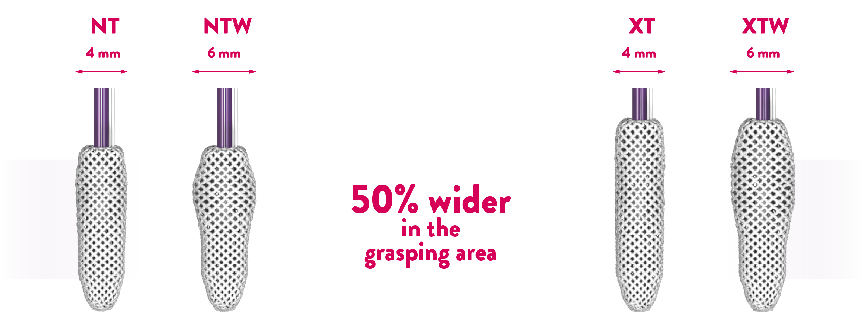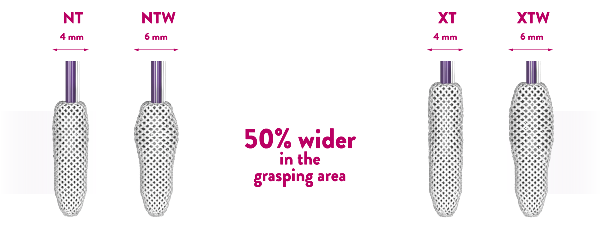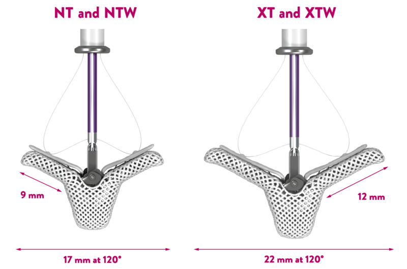 The NTW and XTW clips have a 50% wider grasping area than the NT and XT clips respectively. They are designed to further reduce regurgitant volume reduce MR with the implantation of a single clip.**