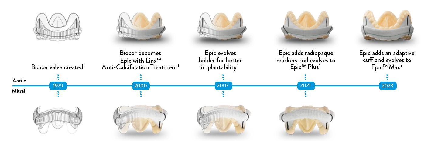 Since 1979, our platform of Epic™ Mitral and Aortic Tissue Valves has combined the best nature has to offer with advanced engineering. Over the decades, minor adjustments to our legacy valve were added gradually, evolving the Epic™ Platform into the innovative porcine tissue valves trusted by physicians today.