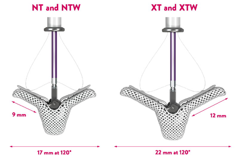 The NTW and XTW clips have a 50% wider grasping area than the NT and XT clips respectively. They are designed to tailor the treatment and further reduce MR with 4 clip options. **
